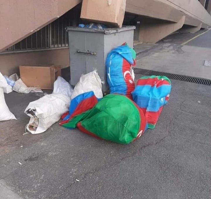 Fotolardan göründüyü kimi bayraqlar köhnə parçadan, rəngi solmuş və ya köhnəlmiş halda deyil, əksinə, bəlkə də bu çirkin məqsədi həyata keçirmək üçün yeni alınan bayraqlardır. Hesab edirəm ki, hətta savadı, anlayışı olmayan insan bayraqdan zibil torbası düzəltməz.