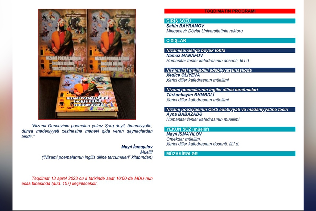 2023-cü il aprelin 13-də Mingəçevir Dövlət Universitetində (MDU) "Nizami poemalarının ingilis dilinə tərcümələri” kitabının təqdimatı keçirilib. MDU-nun Xarici dillər kafedrasının dosenti Mayıl İsmayılovun müəllifi olduğu kitabın təqdimatında universitetin bir qrup professor-müəllim heyəti üzvü, tələbələr və magistrantlar iştirak ediblər.