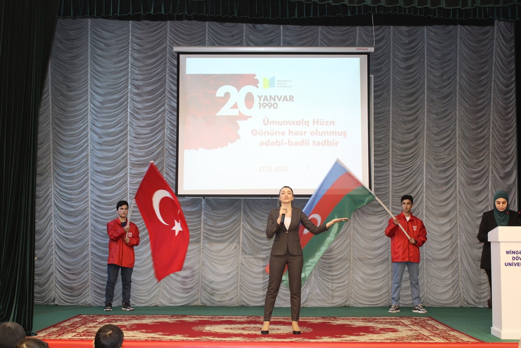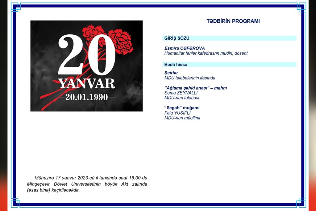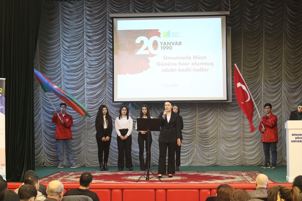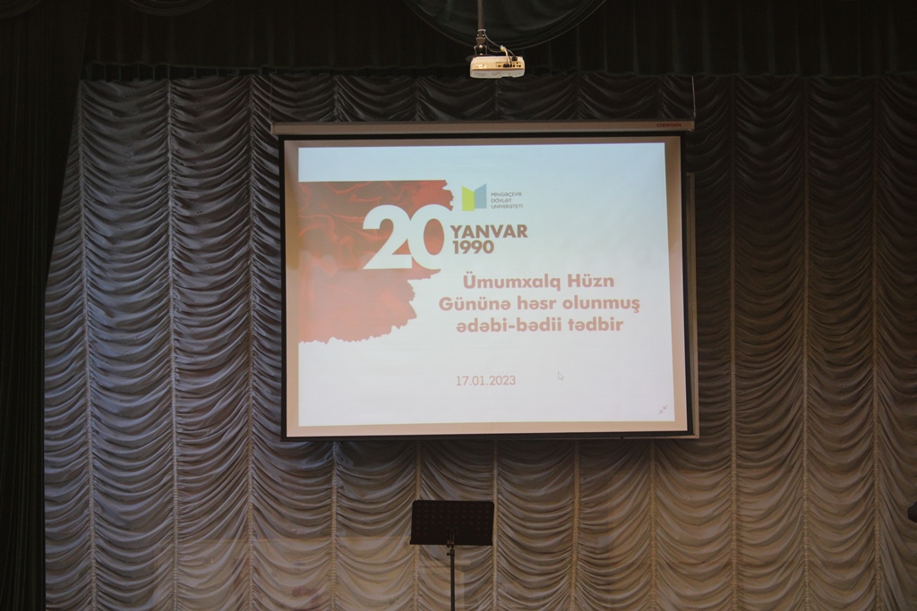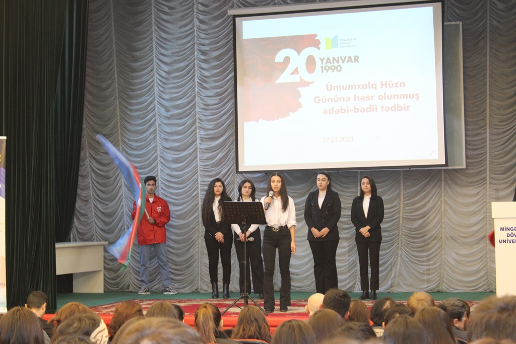 2023-cü ilin yanvarın 17-də Mingəçevir Dövlət Universitetində (MDU) Tələbə Vətənpərvərlik İnkişafı Mərkəzinin (TVİM) təşkilatçılığı ilə 20 Yanvar - Ümumxalq Hüzn Gününə həsr olunmuş ədəbi-bədii tədbir keçirilib. Tədbirdə universitetin akademik və inzibati heyət üzvləri, tələbə və magistrantlar iştirak ediblər.