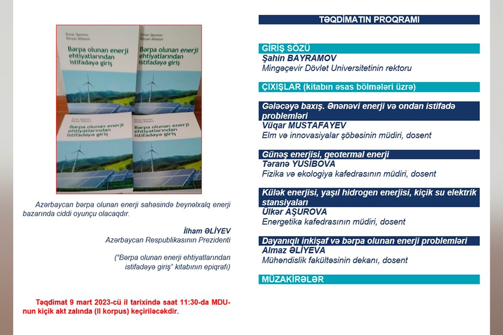 2023-cü il martın 9-da Mingəçevir Dövlət Universitetində (MDU) "Bərpa olunan enerji ehtiyatlarından istifadəyə giriş” adlı kitabın təqdimatı keçirilib.