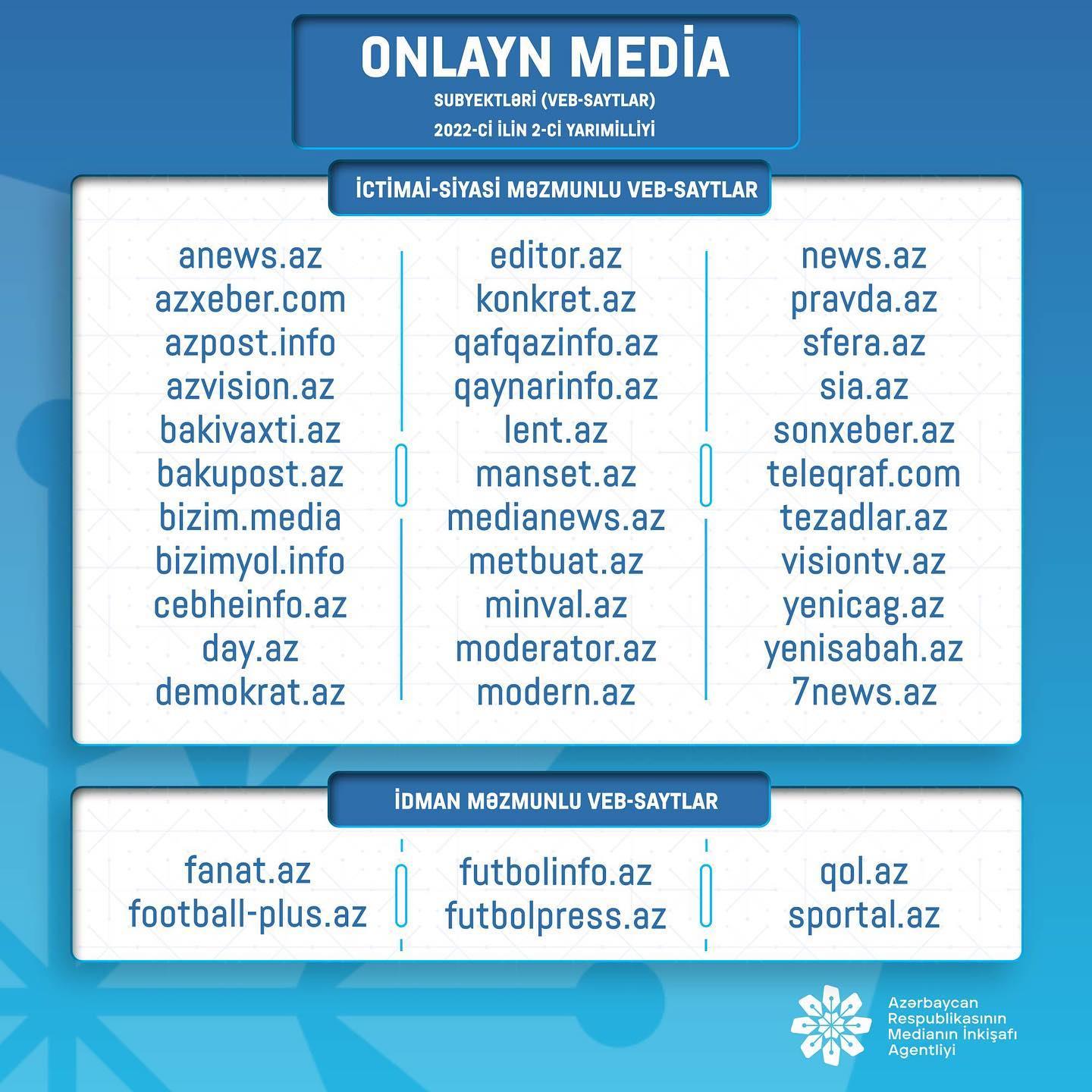 Azərbaycan Medianın İnkişafı Agentliyi onlayn media subyektlərinə (veb-saytlara) dəstək layihəsi çərçivəsində 2022-ci ilin ikinci yarısı üçün elan edilmiş müsabiqənin nəticələrini açıqlayıb.