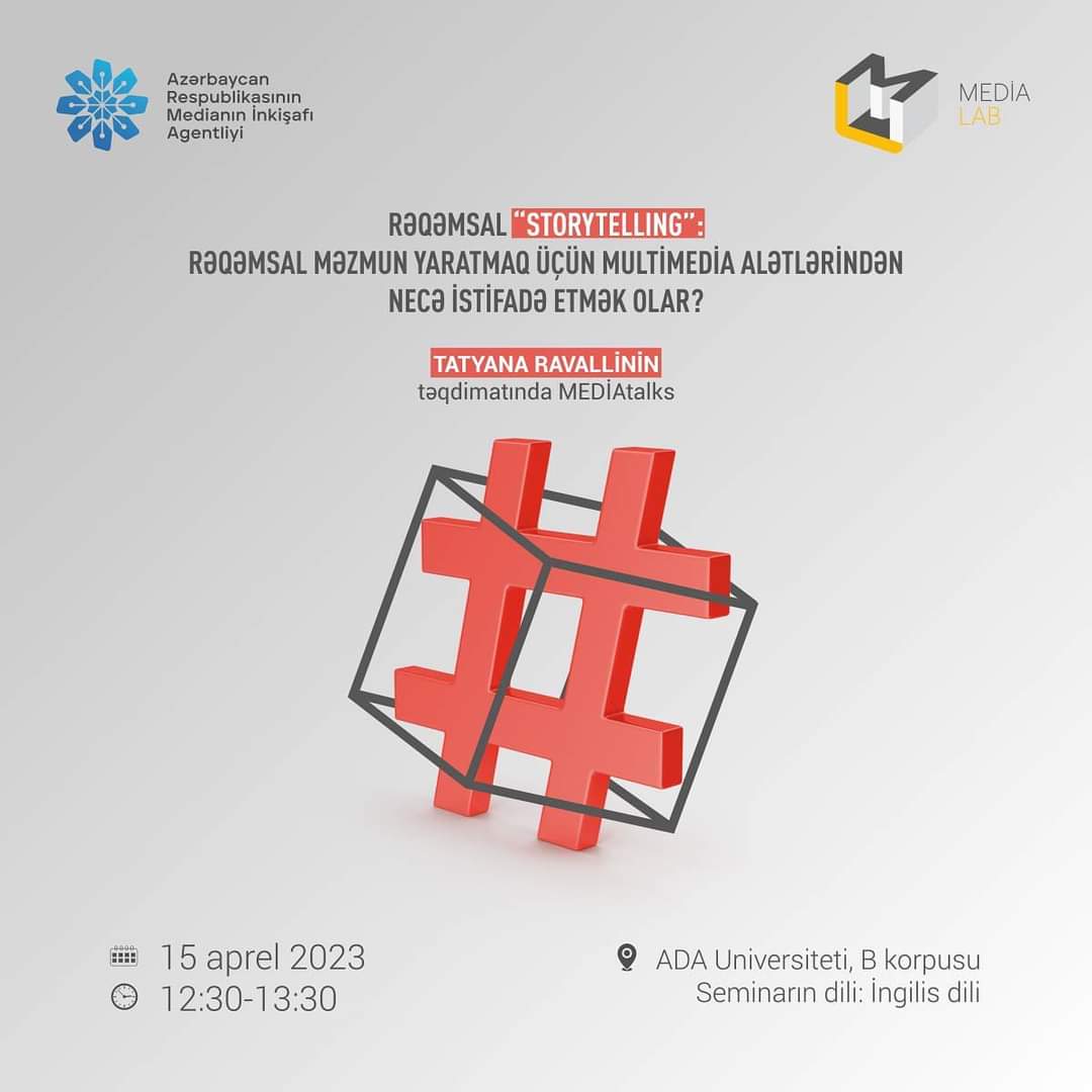 Medianın İnkişafı Agentliyinin təşkilatçılığı və 4 ali təhsil müəssisəsinin - Bakı Dövlət Universiteti, Azərbaycan Dillər Universiteti, Bakı Slavyan Universiteti və Dövlət Bədən Tərbiyəsi və İdman Akademiyasının tərəfdaşlığı ilə həyata keçirilən "MEDİAlab” layihəsi çərçivəsində jurnalistika ixtisasında təhsil alan və jurnalistikaya marağı olan gənclər üçün xarici ekspert Tatyana Ravalli tərəfindən "Rəqəmsal "storytelling”: Rəqəmsal məzmun yaratmaq üçün multimedia alətlərindən necə istifadə etmək olar?” mövzusunda seminar keçiriləcəkdir.