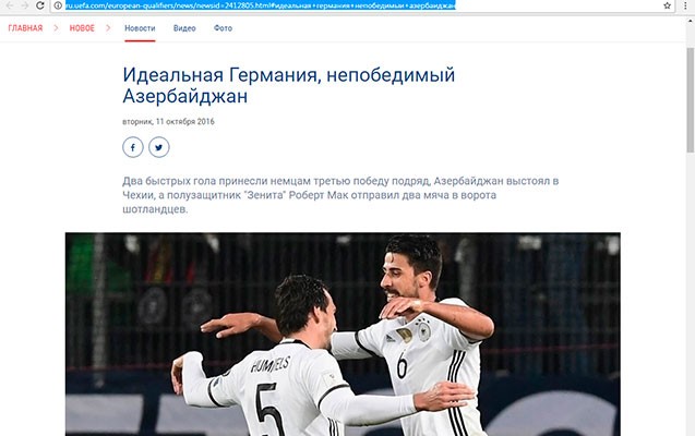 UEFA-nın rəsmi saytı millimizin uğurunu "İdela Almaniya və məğlubedilməz Azərbaycan” başlığı ilə dəyərləndirib.