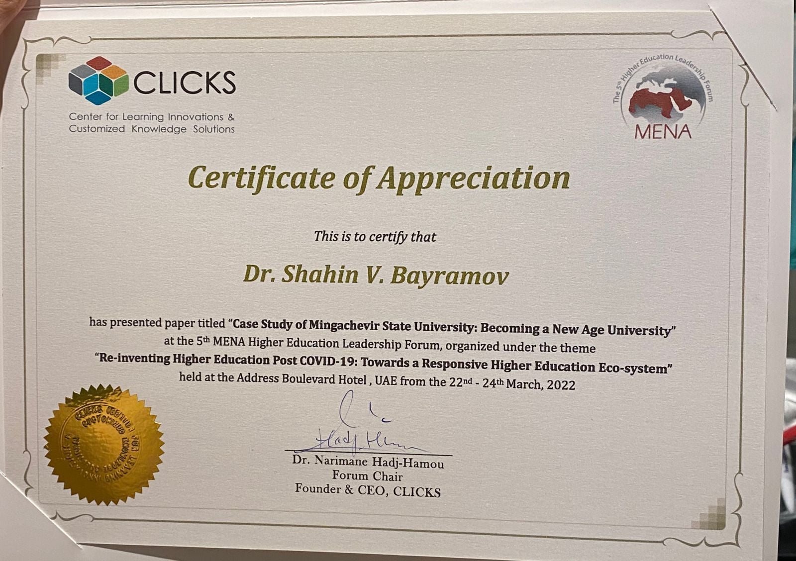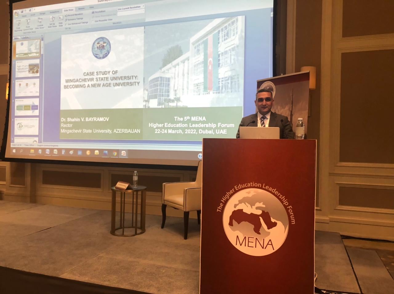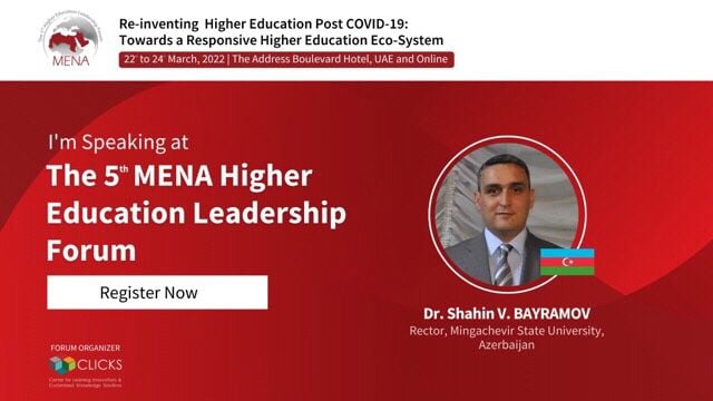 Mingəçevir Dövlət Universiteti (MDU) 2022-ci ilin 22-24 mart tarixlərində Birləşmiş Ərəb Əmirliyinin Dubay şəhərində təşkil edilən 5-ci MENA Ali Təhsil Liderlik Forumunda (The 5th MENA Higher Education Leadership Forum) təmsil olunub. Forum "COVID 19-dan sonrakı dövrdə ali təhsilin yenidən qurulması: daha çevik ali təhsil ekosisteminə doğru” (Re-inventing Higher Education Post COVID-19: Towards a Responsive Higher Education Eco-system) mövzusunda keçirilib.