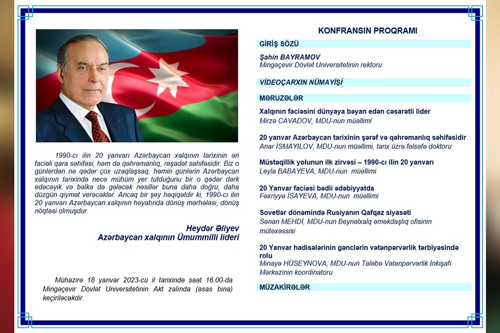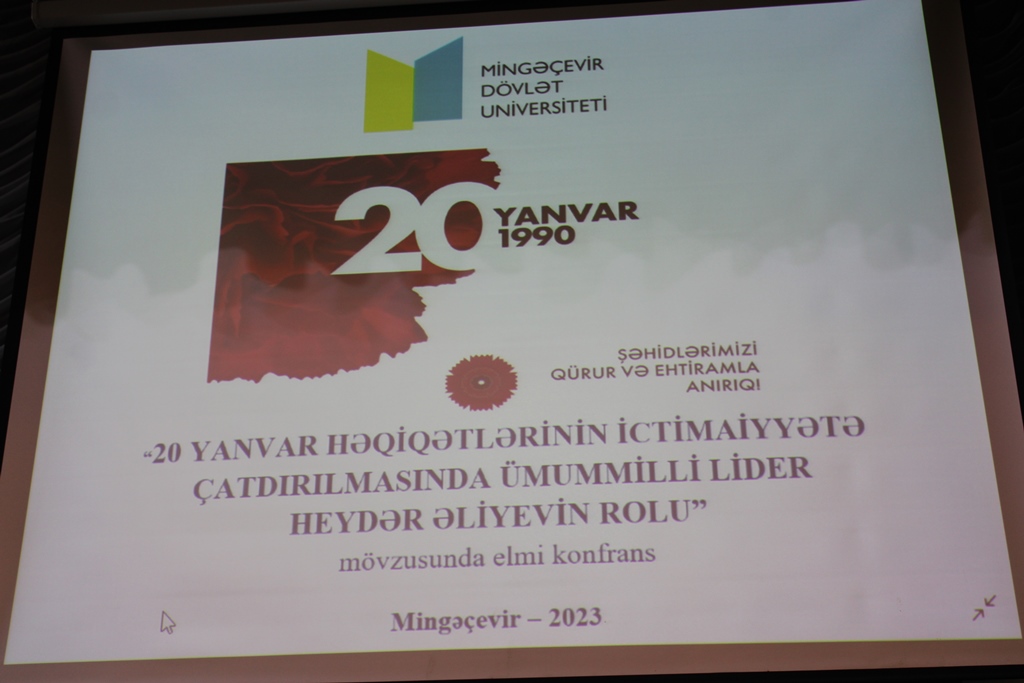 2023-cü ilin 18 yanvar tarixində Mingəçevir Dövlət Universitetində (MDU) Ümumxalq Hüzn Gününə həsr olunmuş "20 Yanvar həqiqətlərinin ictimaiyyətə çatdırılmasında ümummilli lider Heydər Əliyevin rolu” mövzusunda elmi konfrans keçirilib. Konfransda universitetin akademik və inzibati heyəti üzvləri, tələbə və magistrantlar iştirak ediblər.