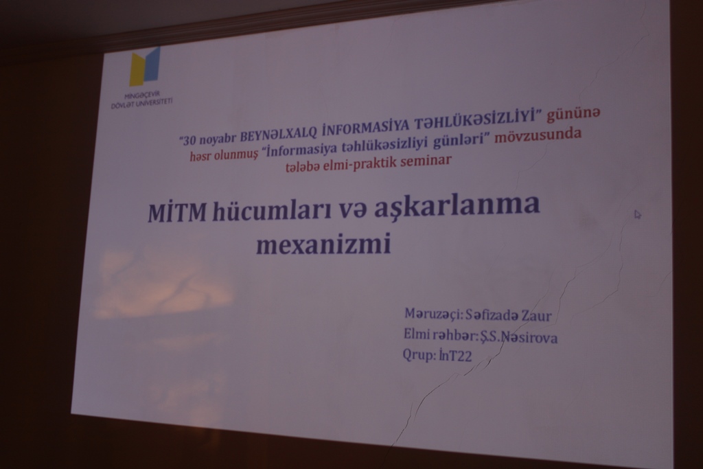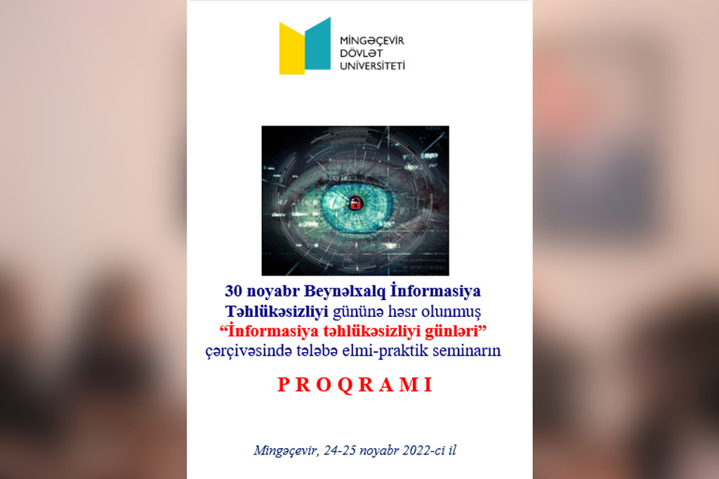 Mingəçevir Dövlət Universitetində (MDU) "30 Noyabr - Beynəlxalq İnformasiya Təhlükəsizilyi Günü” münasibətilə "İnformasiya təhlükəsizliyi günləri”nə (İTG) start verilib. 2022-ci ilin 24-25 noyabr tarixlərində İTG çərçivəsində MDU-da tələbələrin elmi-praktiki seminarı keçirilib.