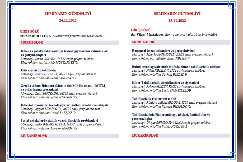 Noyabrın 25-də keçirilən növbəti seminar günündə həmin fakültənin tələbələrindən Məleykə Mahmudlu "Rəqəmsal imza: imkanları və perspektivləri, Nihat Xəlilov "Bulud texnologiyalarında istifadə olunan təhlükəsizlik alətləri”, Rəhman Əliyev "Kiber Təhlükəsizlik Sertifikatları və siyasətləri”, Ruhiyyə Məmmədova "Təhlükəsizlik risklərinin təhlili” və Ülviyyə Əhmədova "Təhlükəsizlikdə Haker anlayışı, növləri, üstünlüklər və çatışmazlıqlar” mövzusunda məruzələrini təqdim ediblər.