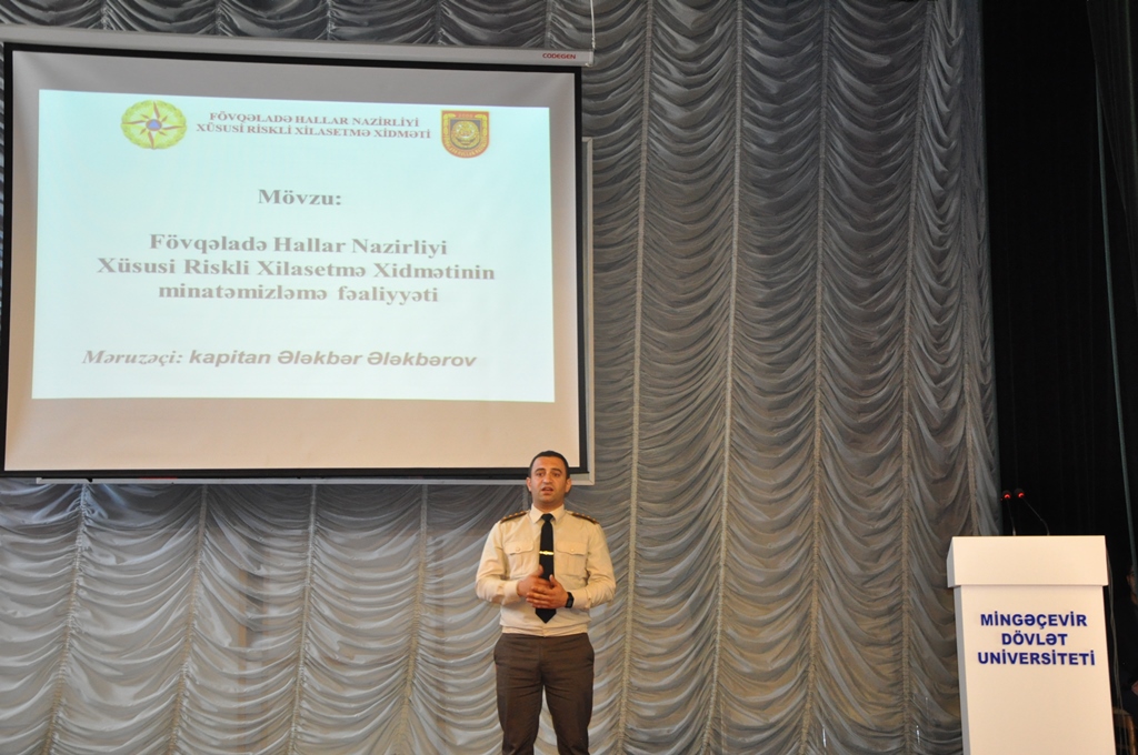 Tədbir iştirakçılarını salamlayan MDU-nun rektoru Şahin Bayramov müzəffər Ali Baş Komandanımız İlham Əliyevin rəhbərliyi və yenilməz Azərbaycan Əsgərinin qəhrəmanlığı sayəsində əldə edilən tarixi Zəfərdən sonra "Böyük Qayıdış” məqsədilə işğaldan azad edilmiş doğma torpaqlarımızda görülən irimiqyaslı quruculuq və abadlıq işlərindən danışıb. Bununla əlaqədar olaraq, ərazilərdə minatəmizləmə əməliyyatlarının sürətlə həyata keçirildiyini qeyd edən rektor, xüsusilə Qarabağa çox sıx ziyarətlərin başlanıldığı hazırki şəraitdə insanlar arasında partlayıcı sursatlara qarşı maarifləndirmə işlərinin vacibliyindən söhbət açıb və tədbirin əhəmiyyətini vurğulayıb. Müharibədən sonrakı dövrdə baş verən faciəvi hadisələrə diqqəti çəkən Təhsil Nazirliyinin məsul əməkdaşı Rövşən Ağayev təhsil müəssisələrində mina təhlükəsinə qarşı maarifləndirmə işlərinin aparılmasının aktuallığı, insanların bu istiqamətdə məlumatlı olmasının əhəmiyyəti və təhlükə vəziyyətində atılmalı olan addımlar barədə danışıb. Sonra, Fövqəladə Hallar Nazirliyinin Xüsusi Riskli Xilasetmə Xidmətinin əməkdaşı Ələkbər Ələkbərov "Fövqəladə Hallar Nazirliyinin Xüsusi Riskli Xilasetmə Xidmətinin minatəmizləmə fəaliyyəti” mövzusunda təqdimatla çıxış edib. Minalanmış ərazilərdə təhlükəsiz hərəkət etmək qaydalarından bəhs edən Ə.Ələkbərov minaların növləri və formaları, onların ola biləcəyi yerlər, minaların gücü və insan sağlamlığına təsiri barədə məlumat verib və iştirakçıların suallarını cavablandırıb. Qeyd edək ki, tədbir Təhsil nazirinin müvafiq əmri ilə təsdiq edilmiş "Təhsil müəssisələrinin müəllim-şagird (tələbə) heyətinin partlayış təhlükəsinə qarşı maarifləndirilməsi barədə metodiki tövsiyələr” haqqında təlimata əsasən təşkil edilib. Əsas məqsəd gəncləri mina və partlamamış hərbi sursatların yaratdığı təhlükə barədə məlumatlandırmaq, rəsmi və qeyri-rəsmi xəbərdaredici mina nişanları, təhlükəli ərazinin olduğunu bildirən əlamətlər, bələd olunmayan yerlərdə xüsusi davranış və minalardan qorunma qaydalarına əməl etmək, mina ilə bağlı bədbəxt hadisələrin qarşısının alınması üçün bilik və vərdişləri aşılamaqdan ibarətdir.