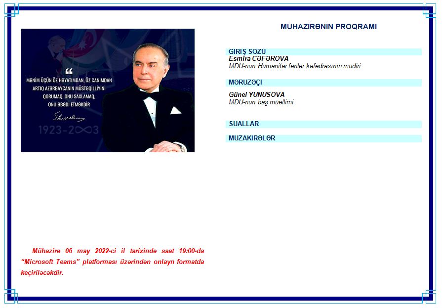 Mühazirədə giriş sözü ilə çıxış edən MDU-nun Humanitar fənlər kafedrasının müdiri, dosent Esmira Cəfərova, adı müasir və müstəqil Azərbaycanın adı ilə bağlı olan, çoxşaxəli və titanik fəaliyyəti ilə adını milli tariximizə qızıl hərflərlə yazan ümummilli lider Heydər Əliyevin zəngin irsinin öyrənilməsinin, gənc nəsil arasında təbliğinin əhəmiyyətindən danışıb və mühazirənin önəmini vurğulayıb.