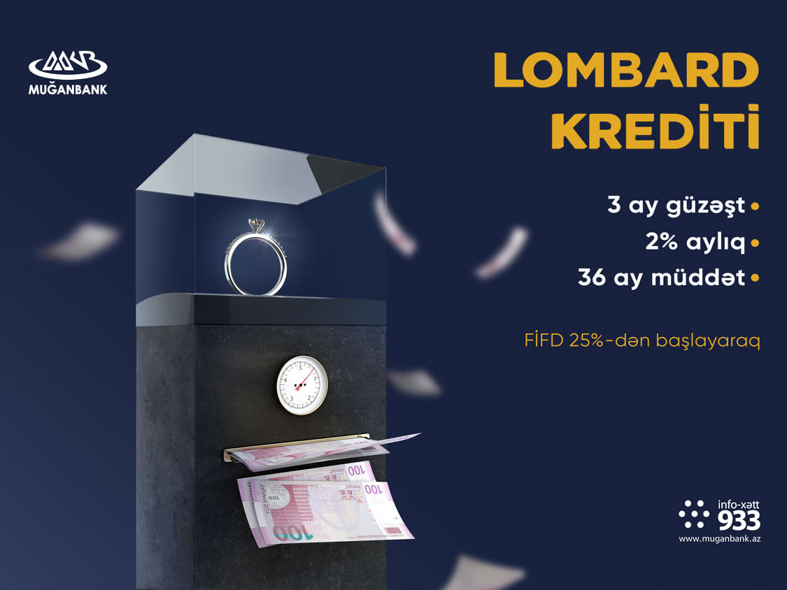 Artıq Muğanbankda Lombard kreditləri daha sərfəlidir. Siz bu kreditləri 3 ay güzəşt müddəti olmaqla, illik 24% dən başlayaraq, 36 ay müddətinə əldə edə bilərsiniz. Kreditin minimal məbləği 300 AZN təşkil edir.