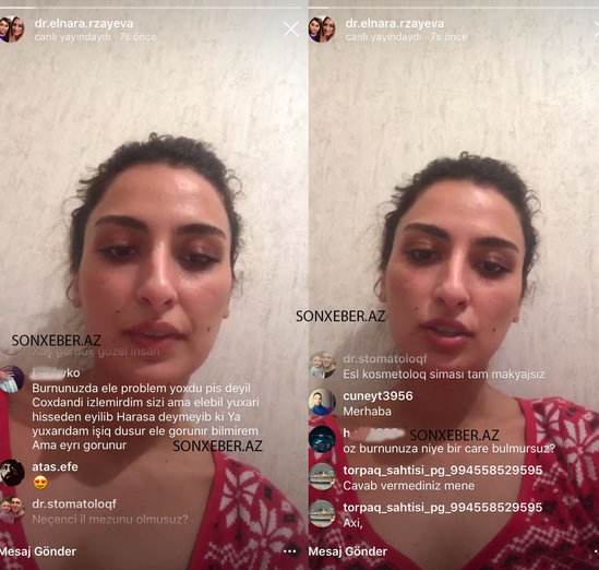 7News.Az-ın sonxeber.az-a istinadən məlumatına görə, canlı yayıma çıxan, izləyicilərin "öz burnunuza niyə çarə bulmursunuz? " sualına hiddətlənən kosmetoloq bunu sakit şəkildə qarşılayıb. Lakin irad bildirən bu şəxsə cavabı gecikməyib. Digər izləyicilərindən biri isə, "elə bil yuxarı hissədən burnunuz əyilib, harasa dəyməyib ki? sualı kosmetoloqu özündən çıxarıb: