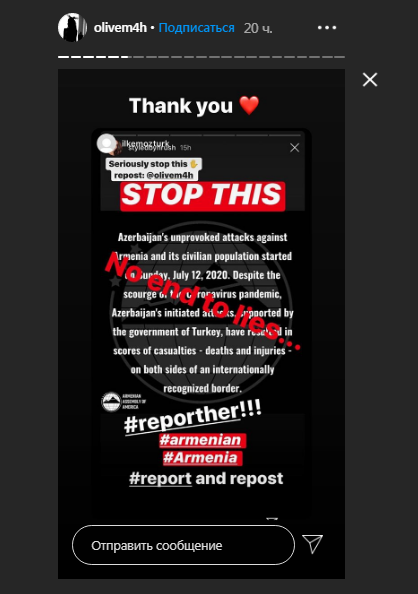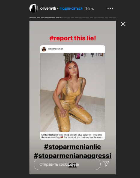 Qeyd edək ki, son günlər sosial şəbəkələrdə Azərbaycan vətəndaşı olan hər kəs, erməni fotomodel, realiti şou ulduzu Kim Kardaşyanın sosial media hesabını şikayət etməyə çağırır. Buna səbəb isə Kardaşyanın "Instagram" hesabında paylaşdığı post olub. Belə ki, o yalan iddialarla izləyicilərini çaşdırmağa çalışıb: