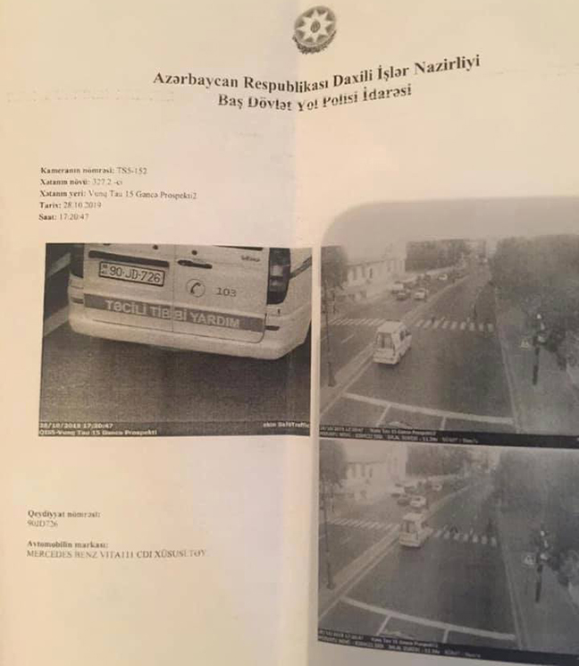 Belə ki, 90 JD 726 dövlət nömrə nişanlı "Mercedes Benz” markalı təcili tibbi yardım maşını İnzibati Xətalar Məcəlləsinin 327.2-ci maddəsi ilə cərimələnib.