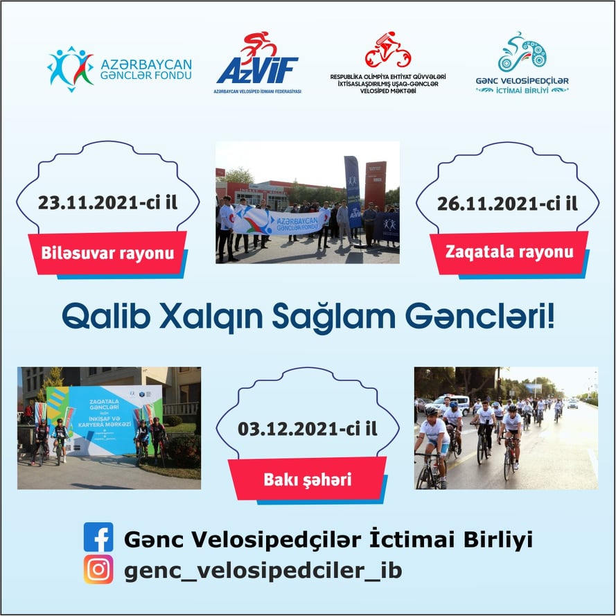 Azərbaycan Respublikası Gənclər Fondunun XV qrant müsabiqəsinin qalibi olaraq "Gənc velosipedçilər” İctimai Birliyi "Qalib xalqın sağlam gəncləri” layihəsi çərçivəsində 23 noyabrda Biləsuvar rayonunda, 26 noyabrda Zaqatala rayonunda və 3 dekabr tarixində Bakı şəhərində velosiped idman növü üzrə nəzəri və praktiki təlimlərə start verir.