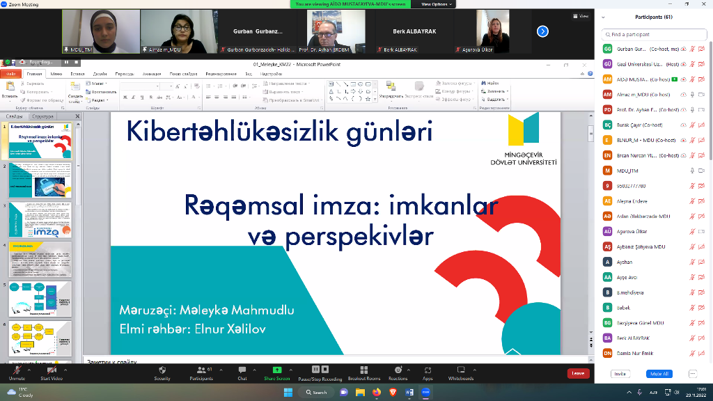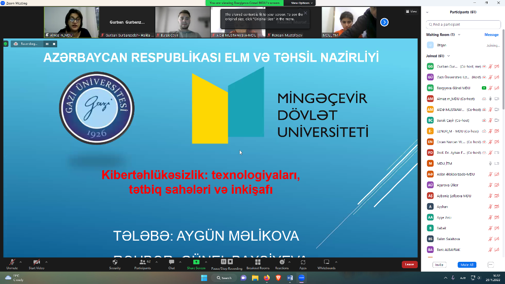 2022-ci ilin 29 noyabr tarixində Mingəçevir Dövlət Universiteti (MDU) və Türkiyənin Qazi Universitetinin birgə təşkilatçılığı ilə "İnformasiya təhlükəsizliyi günləri” çərçivəsində "Kibertəhlükəsizlik: əsas çağırışlar və müasir texnologiyalar” mövzusunda tələbə elmi-praktik seminarı keçirilib.