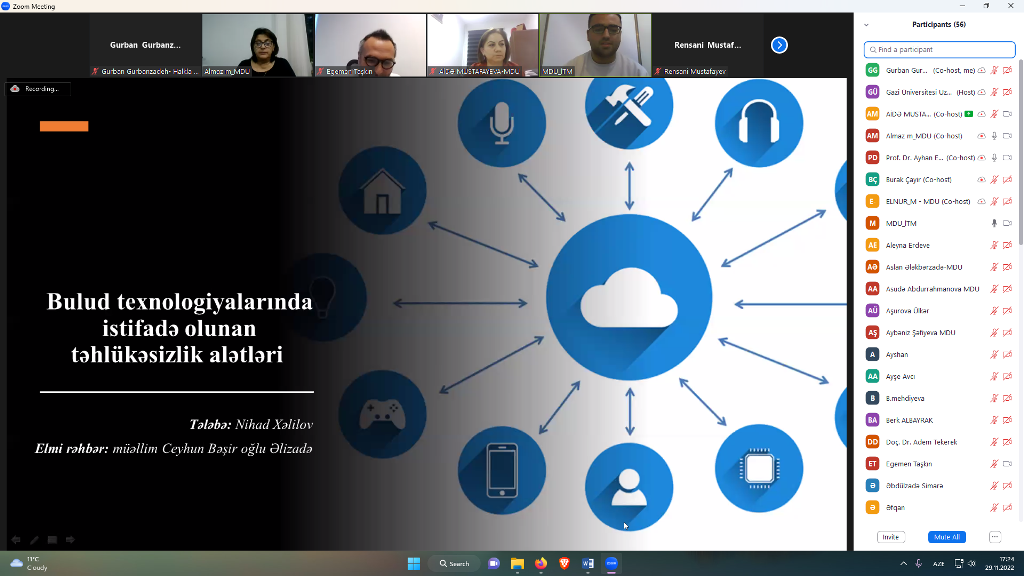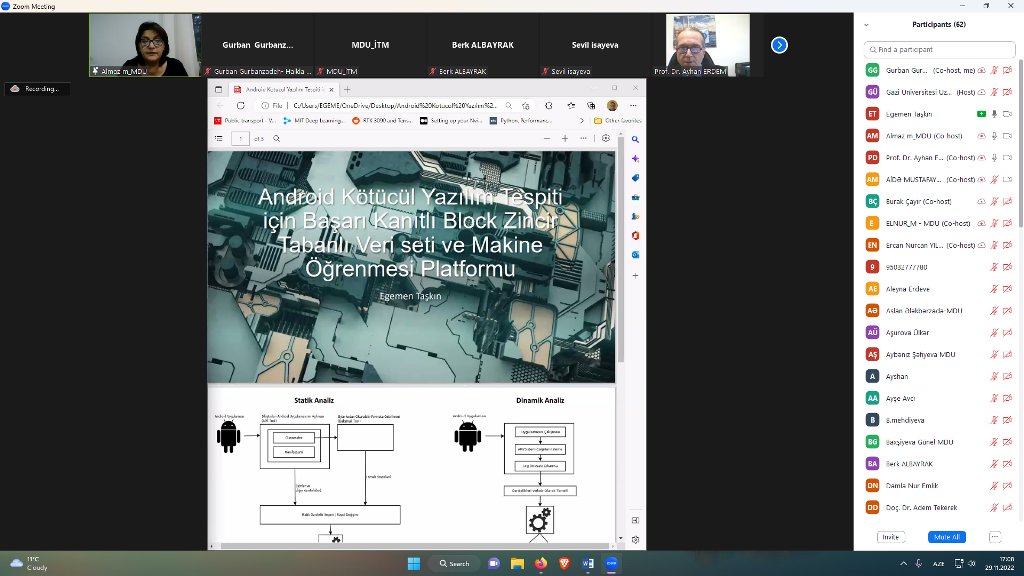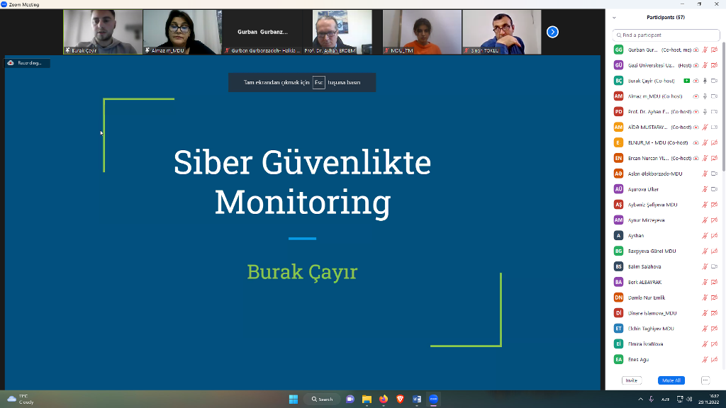 Sonra, seminarın proqramına uyğun olaraq məruzələr dinlənilib. Qazi Universitetinin tələbələrindən Burak Çayır "Kibertəhlükəsizlik sahəsində monitorinq”, Berk Albayrak "Hücum kəşfiyyatı” və doktorant Egemen Taşkın "Android zərərli proqram təminatının aşkarlanması üçün blokçeyn əsaslı verilənlər bazası və maşın öyrənmə platforması” mövzularında, MDU tələbələrindən isə Aygün Məlikova "Kibertəhlükəsizlik: texnologiyaları, tətbiq sahələri və inkişafı”, Məleykə Mahmudlu "Rəqəmsal imza: imkanları və perspektivləri” və Nihat Xəlilov "Bulud texnologiyalarında istifadə olunan təhlükəsizlik alətləri” mövzularında çıxış ediblər.