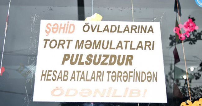 Buna görə sahibkar obyektinin qapısından "Şəhid övladlarına tort məmulatları pulsuzdur, hesabları ataları tərəfindən ödənilib" elanını asıb: "Ötən ilin sonlarından bu aksiyaya start verdik. Yeni il ərəfəsində 20-yə yaxın şəhid ailəsinə tort və müxtəlif şirniyyat məmulatları hədiyyə edilib. Bu günə qədər 30-a yaxın şəhid ailəsinə yardım etdik. Yeni ildən sonra isə şəhid ailələrinə, həmçinin ərzaq və geyim hədiyyələri etmişik".