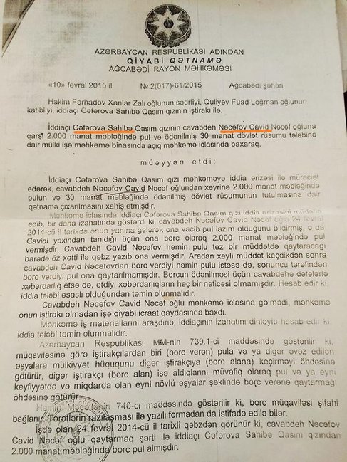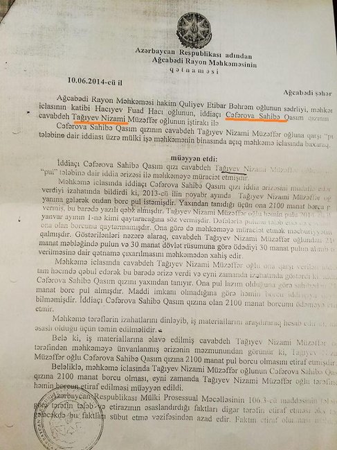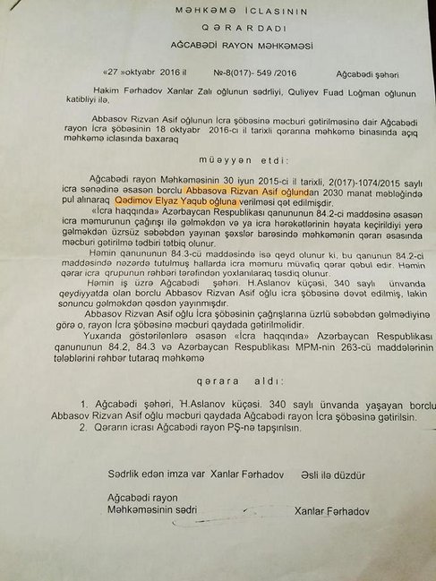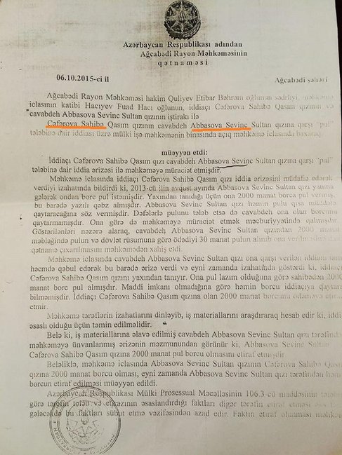 Ağcabədi Rayon Məhkəməsinin yuxarıda adlarını çəkdiyimiz sələmçilərin xeyirinə çıxardığı 5 müxtəlif qətnaməni oxuculara təqdim edirik://Femida.az