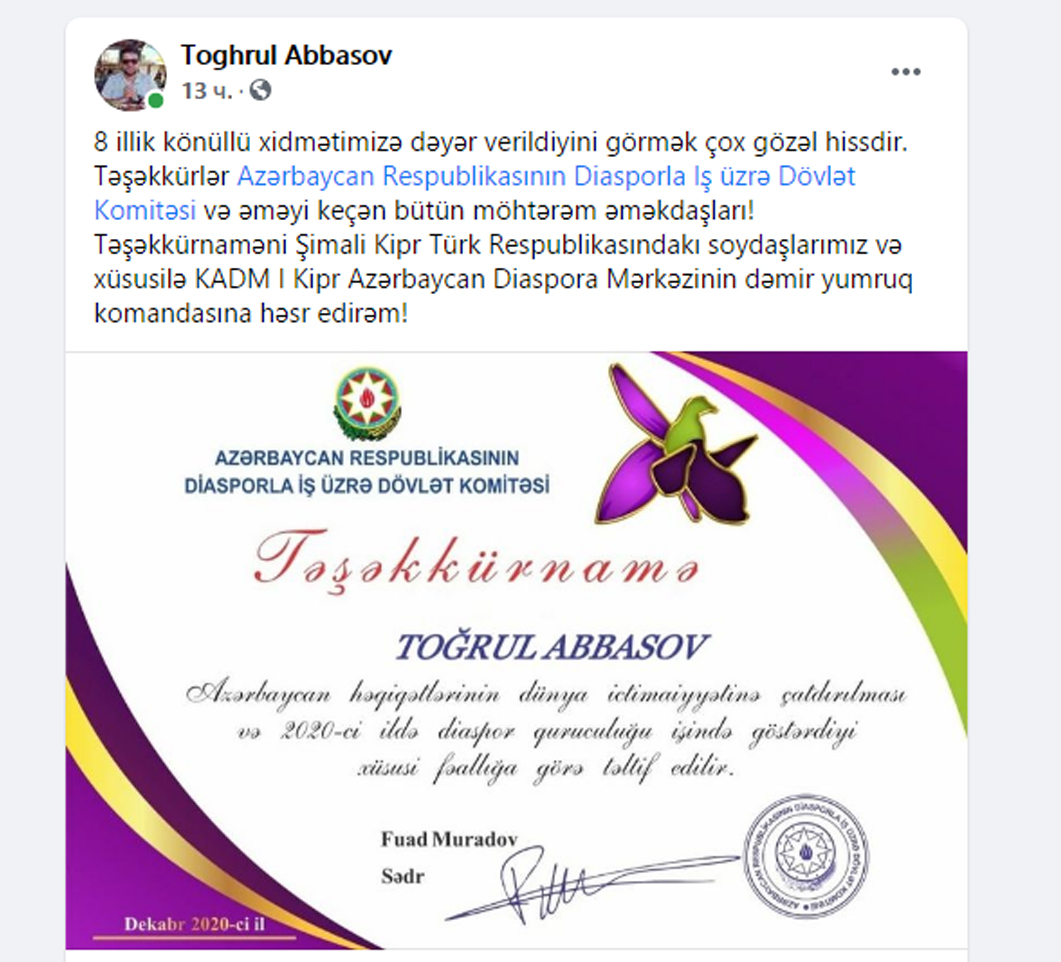 7news.az xəbər verir ki, bu barədə Kipr Azərbaycan Diaspora Mərkəzi adından Toğrul Abbasov yazır: "8 illik könüllü xidmətimizə dəyər verildiyini görmək çox gözəl hissdir. Təşəkkürlər Azərbaycan Respublikasının Diasporla İş üzrə Dövlət Komitəsi və əməyi keçən bütün möhtərəm əməkdaşları! Təşəkkürnaməni Şimali Kipr Türk Respublikasındakı soydaşlarımız və xüsusilə KADM I Kipr Azərbaycan Diaspora Mərkəzinin dəmir yumruq komandasına həsr edirəm!