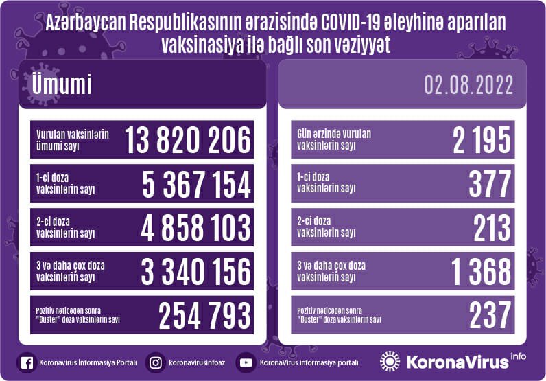 Ölkədə üç və daha çox doza vaksinlərin sayına gəlincə, bu göstərici 1368-dir. Pozitiv nəticədən sonra "buster” doza vaksinlərin sayı 237 olub.