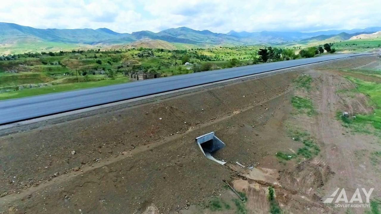 Yol boyunca suların ötürülməsini təmin etmək məqsədi ilə nəzərdə tutulan 37 dairəvi boru üzrə 85%, 9 düzbucaqlı su keçidi üzrə 95%, tikilən yolun ətraf mühitə, o cümlədən faunaya mənfi təsirini azaltmaq məqsədilə 7 yolaltı keçid üzrə 93%, ehtiyat keçidləri üzrə isə 80% tikinti işləri icra olunub.
