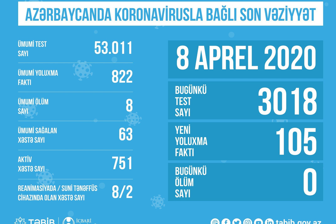 Xatırladaq ki, bu gün Azərbaycanda koronavirusa 105 yeni yoluxma faktı qeydə alınıb. Ölkədə ümumilikdə koronavirusa 822 yoluxma aşkarlanıb. Onlardan 63-ü sağalıb, 8-si ölüb. Hazırda aktiv xəstə sayı 751-dir.