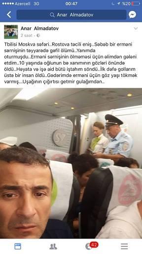 Anar Almadatov adlı azərbaycanlı "facebook” səhifəsində yazıb ki, "yanımda oturan erməninin ölməməsi üçün əlimdən gələni hər şeyi etdim”.