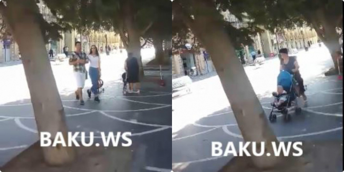 O, əvvəl qızın üstünə uşaq arabasını sürərəq sonra onu bərk vurub. Aqressiv qadın videogörüntüdə balaca oğlanın əlini buraraq ona sərt şəkildə xəbərdarlıq edib. /baku.ws