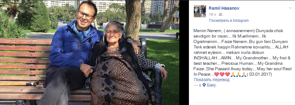 "Mənim nənəm, dünyada ən çox sevdiyim bir insan, ilk müəlliməm – Faizə nənəm bugün fani dünyanı tərk edərək haqqın rəhmətinə qovuşdu. Allah rəhmət eləsin, məkanı nurla dolsun!”