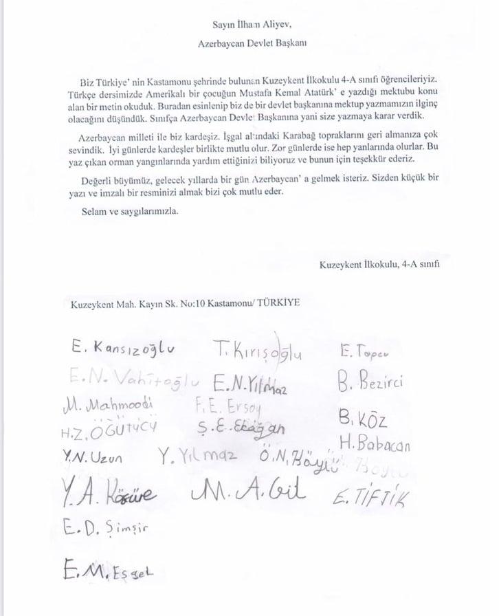 Türkiyə məktəbliləri Prezident İlham Əliyevə məktub yazaraq Qarabağın işğaldan azad olunmasına çox sevindiklərini və nə vaxtsa ora səfər etməyi arzu etdiklərini bildiriblər.