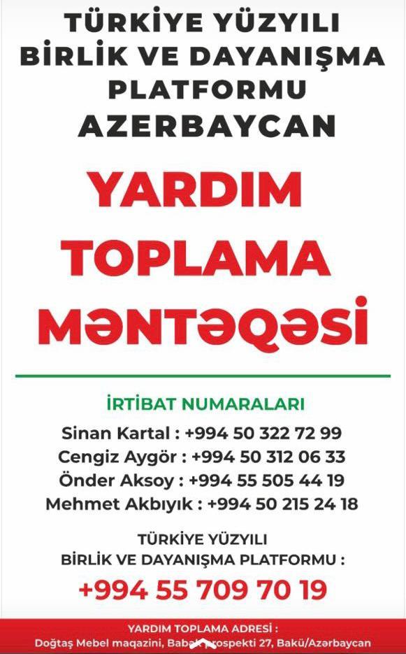 Türkiyənin Azərbaycandakı səfirliyi zəlzələdən zərərçəkənlərə humanitar yardımla bağlı Azərbaycan vətəndaşlarına müraciət edib.