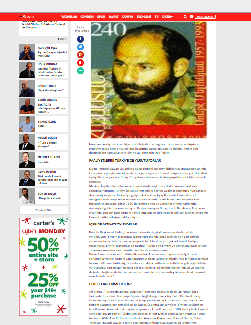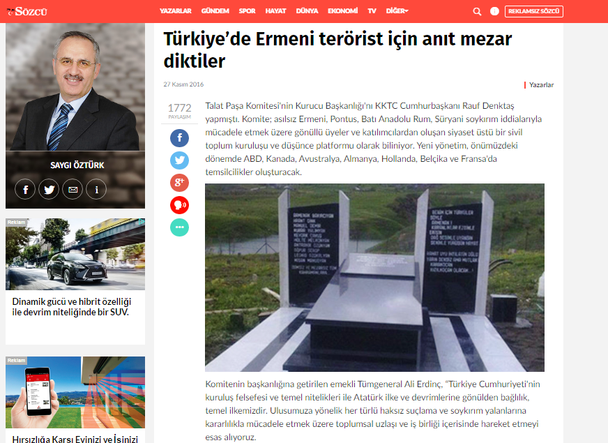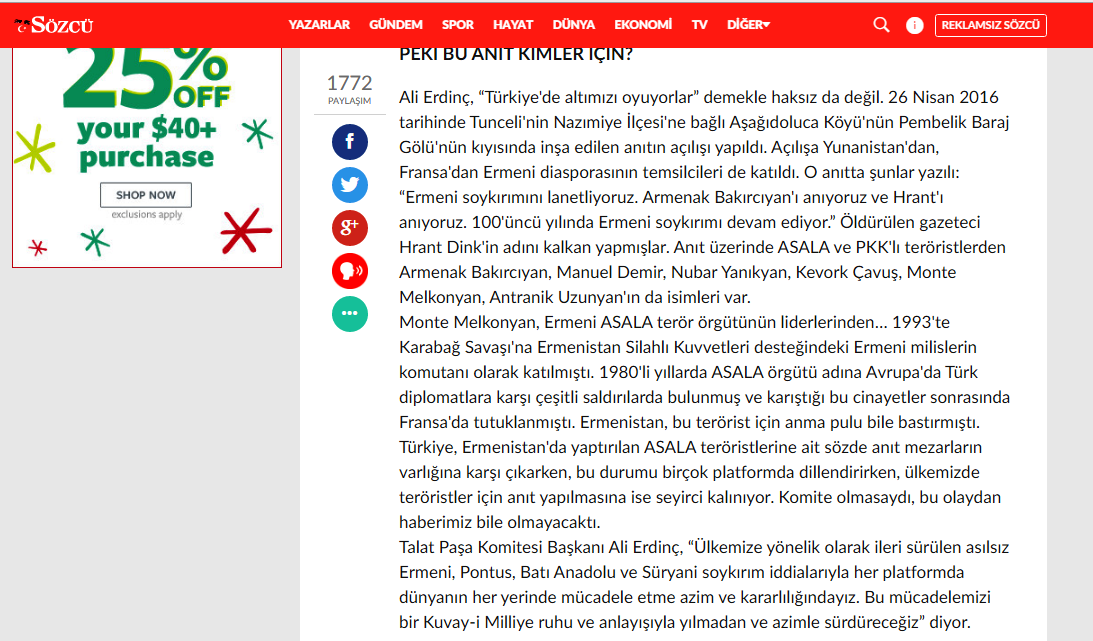 "Erməni və PKK üzvləri Türkiyənin nəzarətdən kənar bölgələrində terrorçulara abidə ucaldaraq, Türkiyədə altımızı qazmağa çalışırlar. Həmin abidənin açılış mərasimi bu il aprelin 26-da keçirilib. Mərasimə Fransa və Yunanıstandan da erməni diasporu nümayəndələri qatılıblar. Abidənin üzərində ASALA terror təşkilatı üzvlərindən və radikal erməni millətçilərindən olmuş Armenak Bakırcıyan, Manuel Dəmir, Nubar Yanıkyan, Kevork Çavuş, Monte Melkonyanın adları da əks olunub. Abidə üzərində bu sözlər də yazılır: "Erməni soyqırımını lənətləyirik, Armenak Bakırcıyanı və Hrant Dinki anırıq. Erməni soyqırımı 100-cu ildönümündə də davam edir".