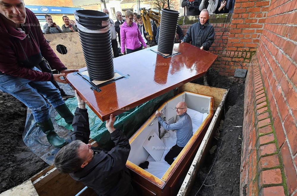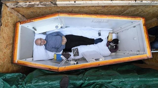 "Mən bu addımla spirtli içki, sakitləşdirici dərmanlar və depressiyadan xilas olmaq istəyirəm. Hazırda 61 yaşım var, mən bu tabutda ən azı üç gün keçirəcəm ki, günahlardan xilas olum. Tabutda nəfəs almaq üçün boru və internetə qoşulmaq üçün vay-fay cihazı da yerləşdirilib. Hətta, baş daşım da hazırdır”.