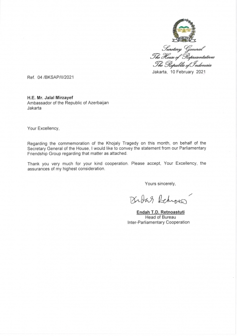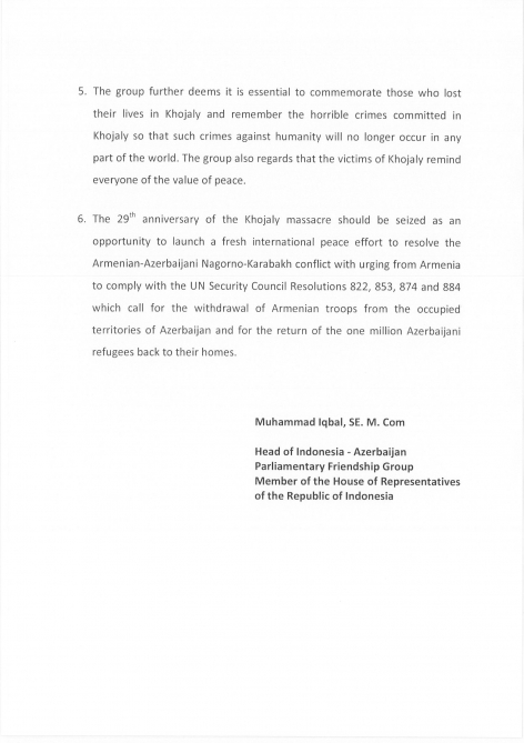 İndoneziyanın Nümayəndələr Palatasında fəaliyyət göstərən İndoneziya-Azərbaycan parlamentlərarası dostluq qrupunun sədri Məhəmməd İqbal Xocalı qətliamının 29-cu ildönümü ilə əlaqədar bu qrupun adından bəyanat yayıb.