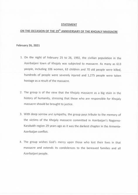 Sənəddə qrup üzvləri Xocalı qətliamının insanlıq tarixinə böyük ləkə kimi düşdüyünü, bu soyqırımının təşkilinə görə məsuliyyət daşıyan şəxslərin beynəlxalq səviyyədə cəzalandırılmalı olduğunu vurğulayıblar. Ermənistan-Azərbaycan münaqişəsinin ən qara səhifəsi olan, 29 il bundan əvvəl Azərbaycanın Dağlıq Qarabağ bölgəsində törədilən Xocalı qətliamı qurbanlarının xatirəsinin qrup üzvləri tərəfindən dərin kədər və təəssüf hissi ilə yad edildiyi, bu qətliam nəticəsində həlak olanlara Allahdan rəhmət dilədikləri, onların ailə üzvlərinə və bütün Azərbaycan xalqına başsağlığı verildiyi qeyd olunub.