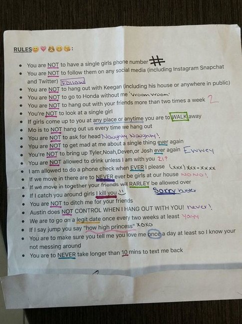 Adı açıqlanmayan qız sevgilisi üçün 22 qayda tətbiq edib. Qaydalara görə, oğlanın ətrafında qız ola bilməz, o, oğlan dostları ilə də az vaxt keçirməli, hər şey üçün icazə almalıdır.