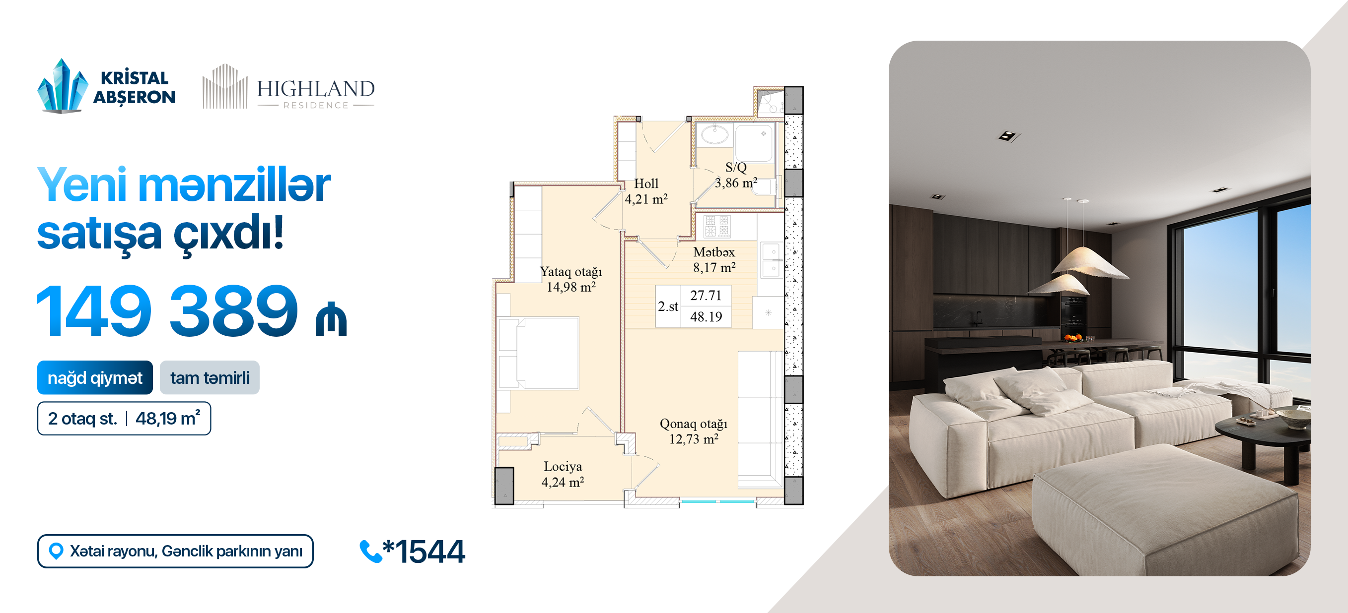Siz də şəhər mərkəzinə yaxın, tam təmirli mənzil sahibi olmaq, üstəlik bunu faizsiz kreditlə əldə etmək istəyirsinizsə, "Highland Residence"də möhtəşəm fürsət sizi gözləyir.