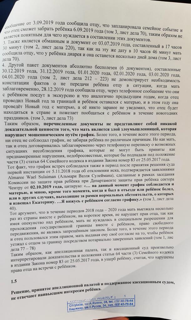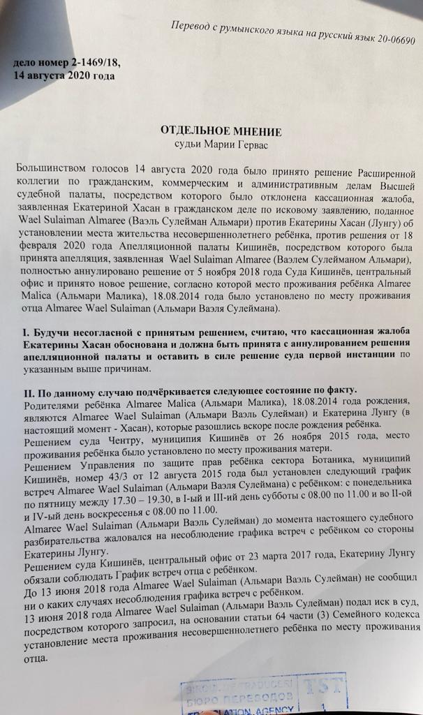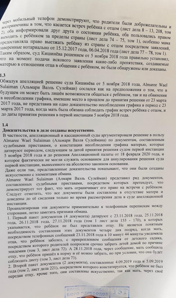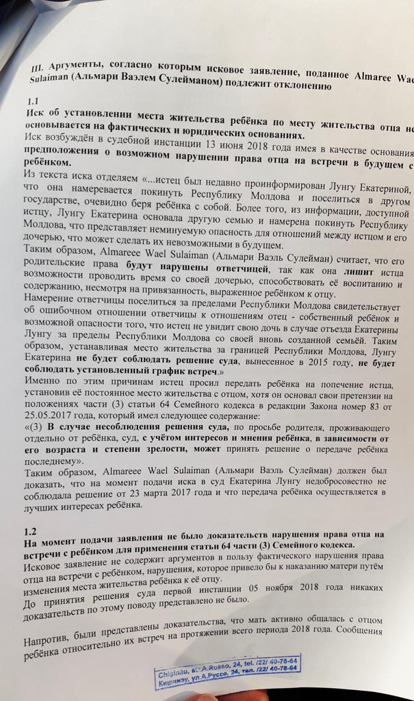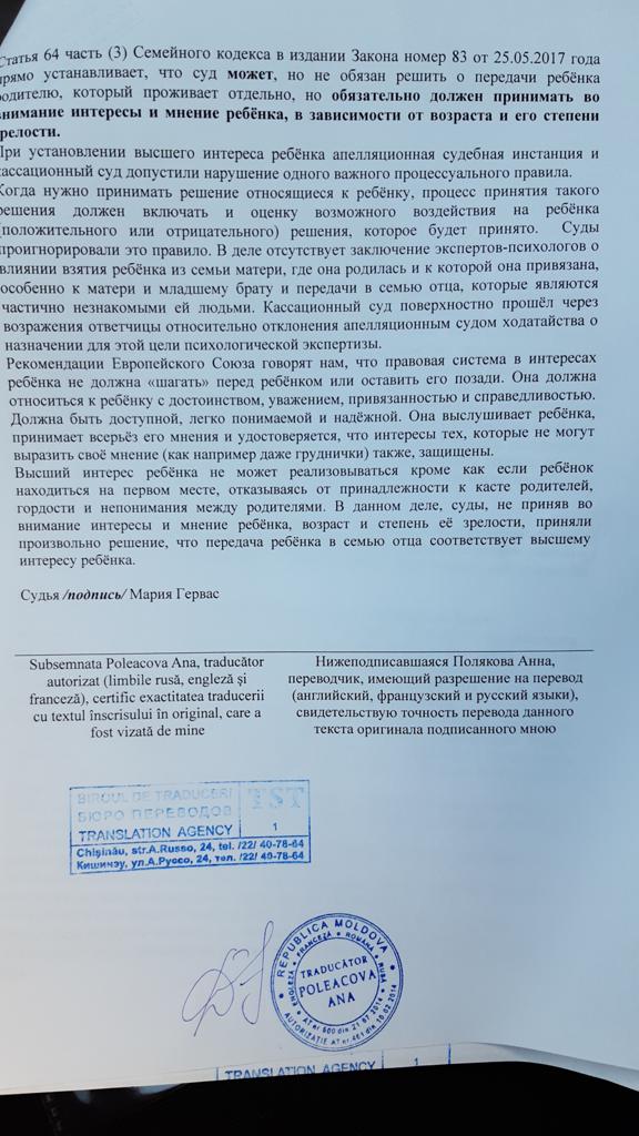 Мои опасения по поводу встречи отца с ребенком не беспочвенны, ведь как только Апелляционный суд решил передать ребенка отцу, он забрал его из детского сада в Молдове и больше я ее не видела и не имела никакого контакта с дочерью! Я дневала и ночевала у ворот его дома лишь бы увидеть ребёнка! Но все тщетно! Затем он забрал дочь и пытался вывести ее за границу с Украиной, таким образом лишить меня контакта с ней навсегда! Слава Богу, по решению Верховного суда Молдовы дело было приостановлено, и он был вынужден вернуть дочь обратно домой к матери!